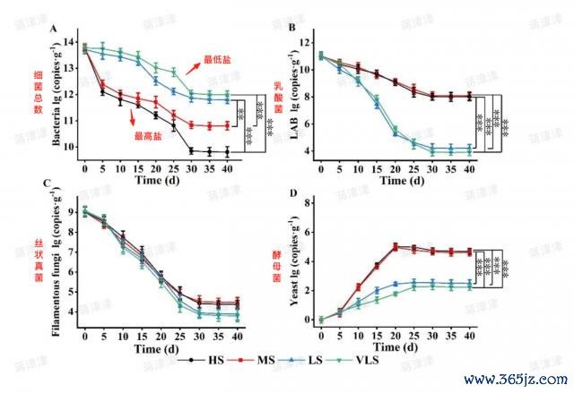 A 图,最低盐酱油细菌总额最多,最高盐酱油细菌总额最少;D 图,最低盐酵母菌数最少,最高盐酵母菌数最多。