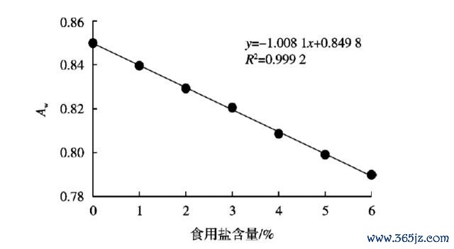 跟着食用盐异常添加量的加多,水活度呈线性裁减,反之盐越少,水活度就会线性加多。