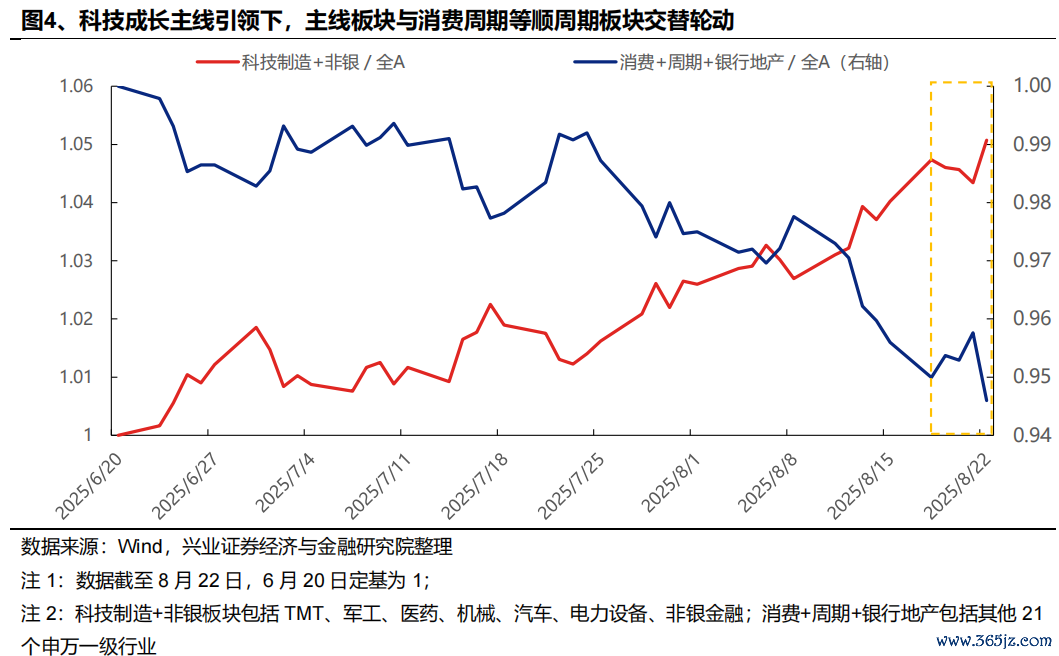 本周行情节拍就较好地证明了这种“干线引颈、轮换轮动”的特征。科技成长干线经历前期的链接上行后,本周周初进入阶段性休整,此时低位的顺周期板块好像实时骁勇,使得阛阓情谊莫得马上冷却,进而在周五科技成长干线休整到位后,引颈阛阓再改进高。