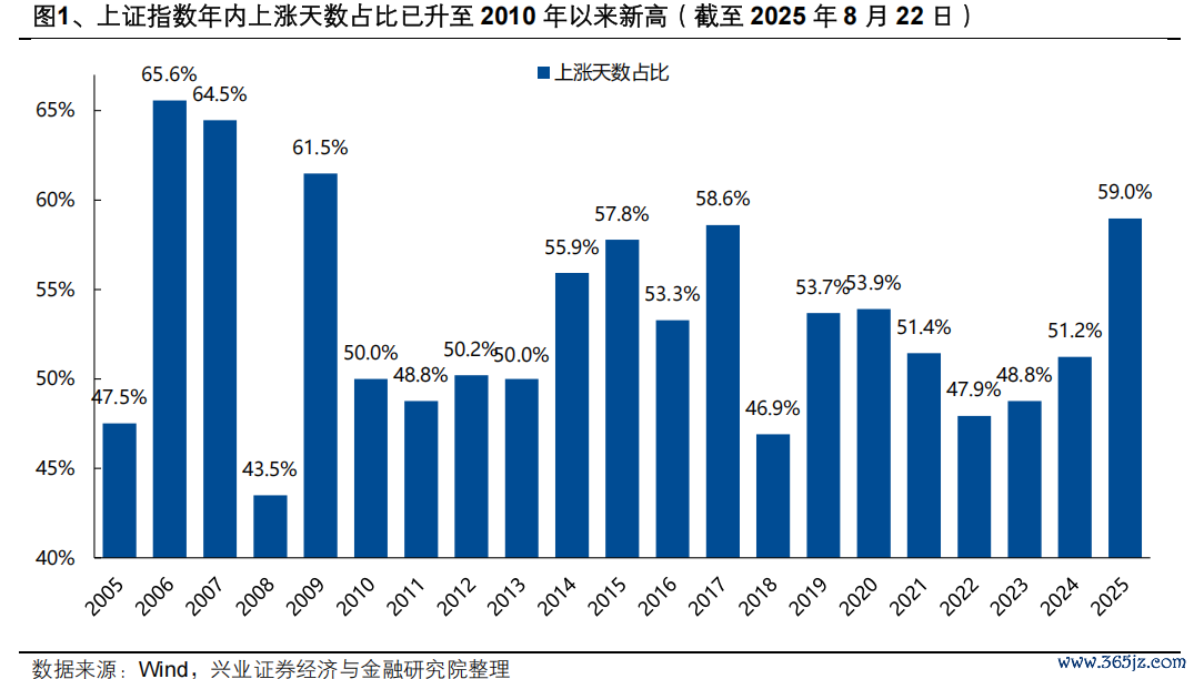 咱们在上周周报昭着地建议,本轮阛阓正在经历一轮“健康牛”,近期投资者对于本轮行情的握续性也有了更深的感受。本周事后,上证指数年内高潮天数占比已升至2010年以来新高。要是只统计6月23日以来的45个交畴昔,期间上证指数唯有12个交畴昔下降,高潮天数占比达到73.3%。