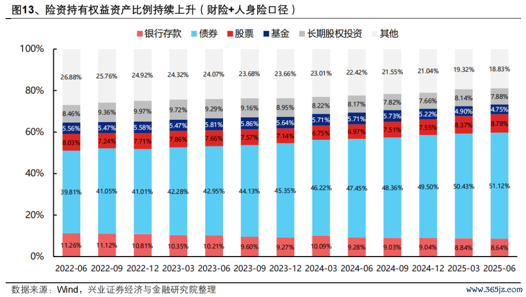 2)多项策略推动险资入市近似保费握续增长,险资握续加大权益钞票配置,轨则25Q2股票握仓占比升至8.8%,股票+基金占比升至13.5%,均处于连年来的最高水平。跟着险资对权益钞票的配置力度不时加大,其功绩中的投资收益与阛阓走势的联动性愈发彰着,阛阓上行周期中将具备更强的收益弹性。