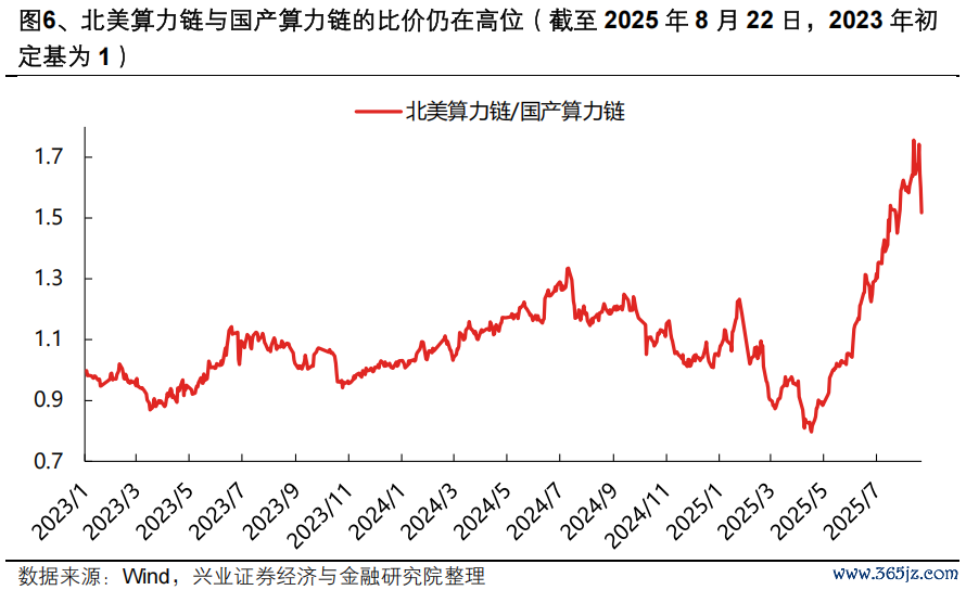 北好意思算力与国产算力比价来看,仍在高位。咱们精选A股中20家北好意思算力标的(光模块、PCB等场所)与20家国产算力标的(国产芯片产业链、管事器等场所),区别构建“北好意思算力链”与“国产算力链”指数。两者比价来看,4月下旬以来北好意思算力链已在握续跑赢国产算力链,近期国产算力大涨后,两者比价仍在高位。